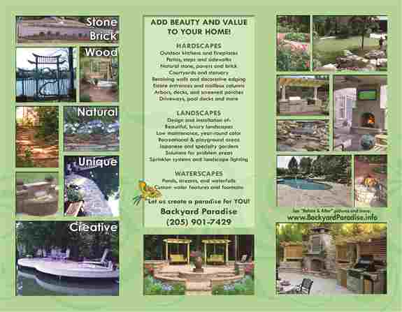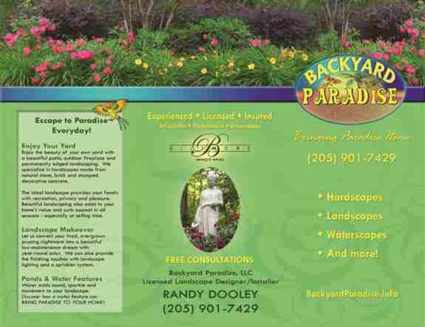 We bring paradise to your home that also adds value to your home by installing beautiful hardscape, landscapes, waterscapes, lighting, sprinkler systems, and more. Randy Dooley, licensed landscape designer, has been creating and installing front, side, and backyard paradises all over Birmingham and a little beyond for almost 20 years.Visit our exhibit and see what he has created on top of a hundred square feet of concrete and steel, then just imagine what he can do with your yard! Look through our photo books (on paper, online, and on screen) to get your thoughts churning on how new landscaping, an outdoor kitchen, stone patio with fire pit, pond with waterfall, or landscape lighting would enhance your home's appearance and value.